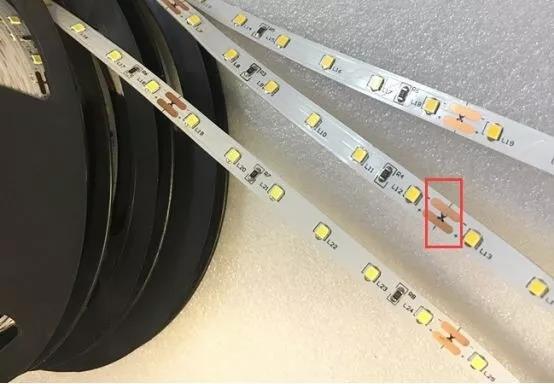 燈帶上每隔一小段就有一個剪刀標識,代表這個地方可以剪斷。一般是多長剪一次呢?取決于燈帶的工作電壓。比如說這根歐普24V燈帶,是六顆珠一個剪刀口,一般每一段長度是10cm。像有的12V,是3顆珠一剪,大概5cm。